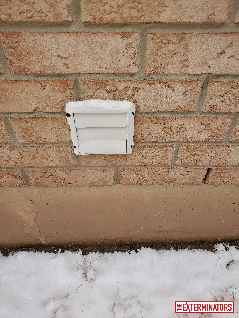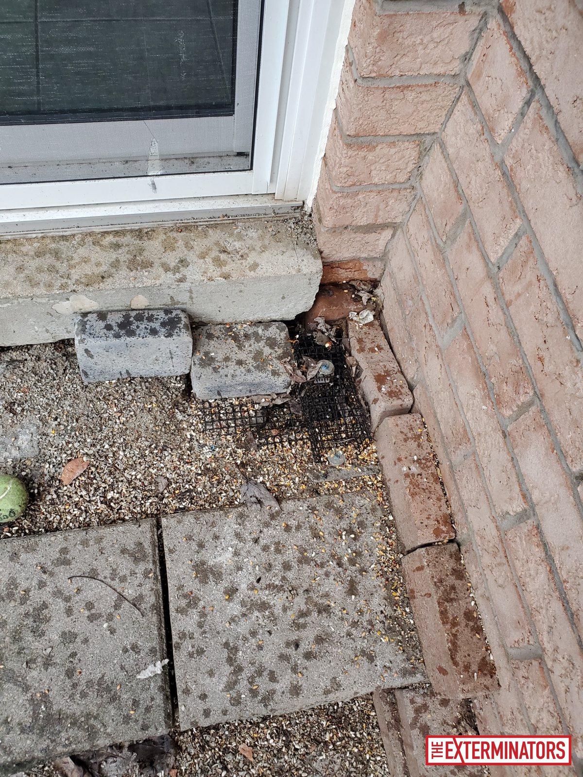 During the initial exterior inspection, multiple potential rodent entry points were identified along the foundation, siding transitions, wall vents, and weep vents. Some openings were located at grade level, while others were associated with utility and vent penetrations.