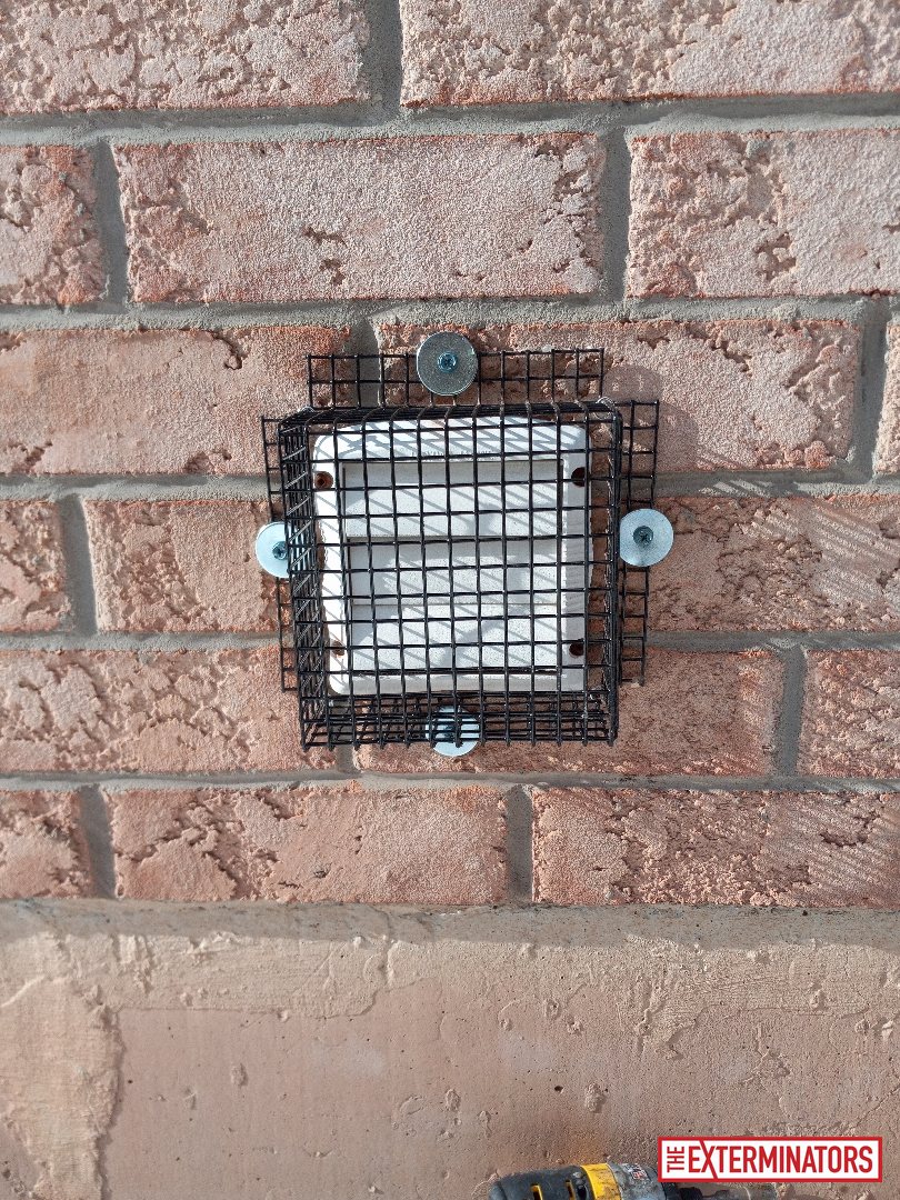 Photos show screened wall vents, sealed foundation sections, and mesh installations completed flush to the masonry surface.